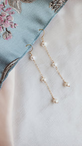 Elevate your style with our Abba Pearl Statement Earrings—perfect for weddings or any occasion. These stunning earrings feature three tiers of floating pearls on a 14kt gold fill or sterling silver chain, adding a touch of elegance to your bridal look or everyday attire. Loved by all ages, their timeless charm and versatility make them a must-have for any jewelry collection.