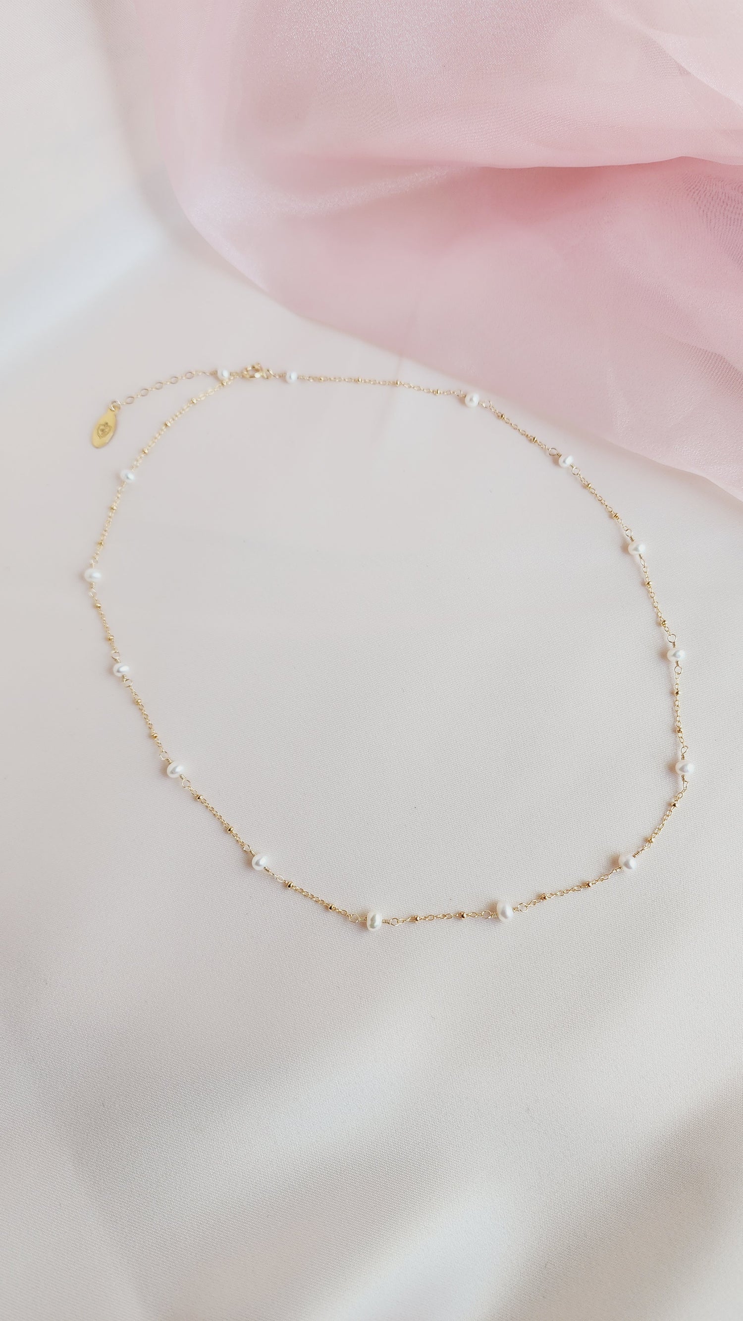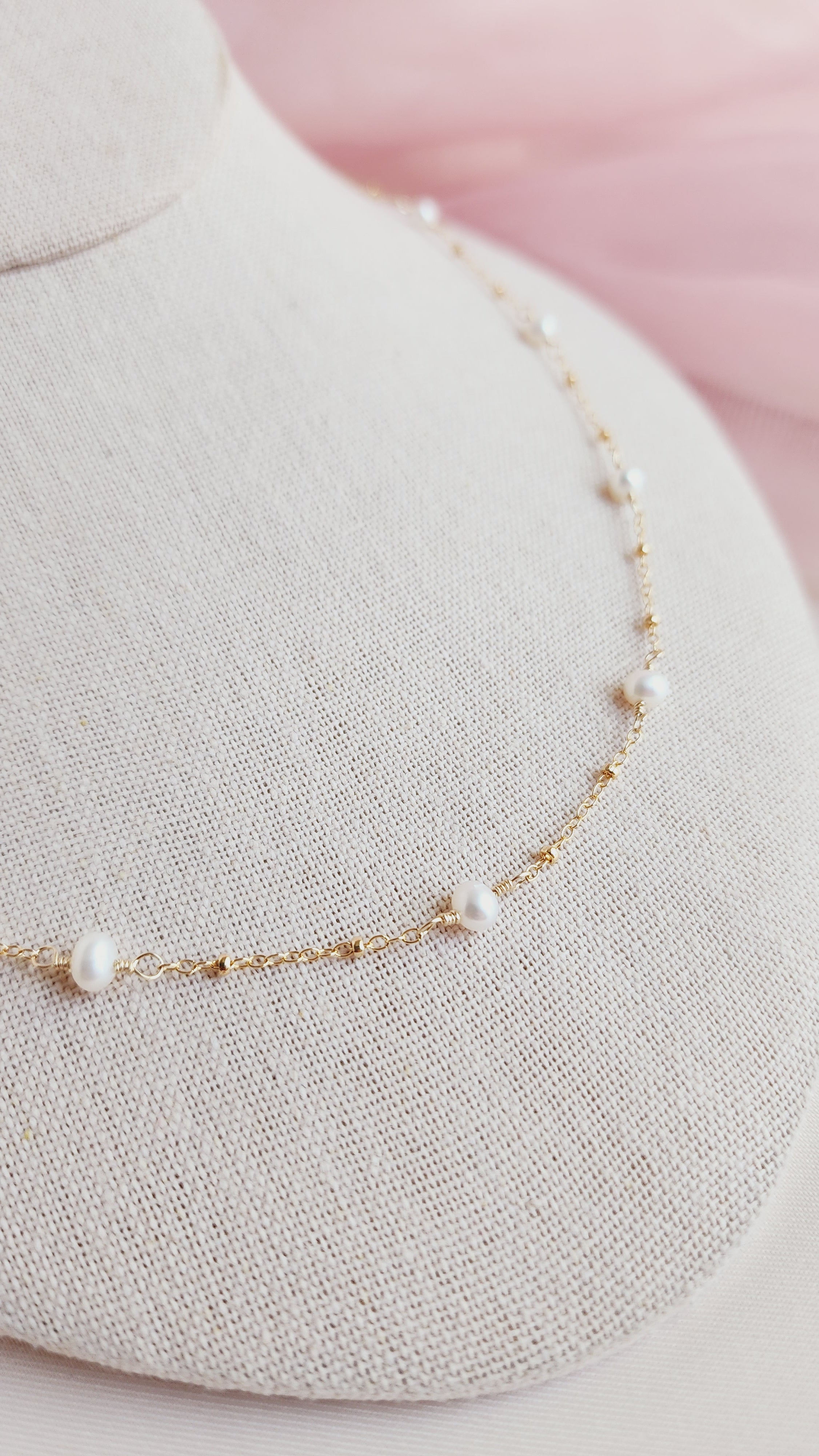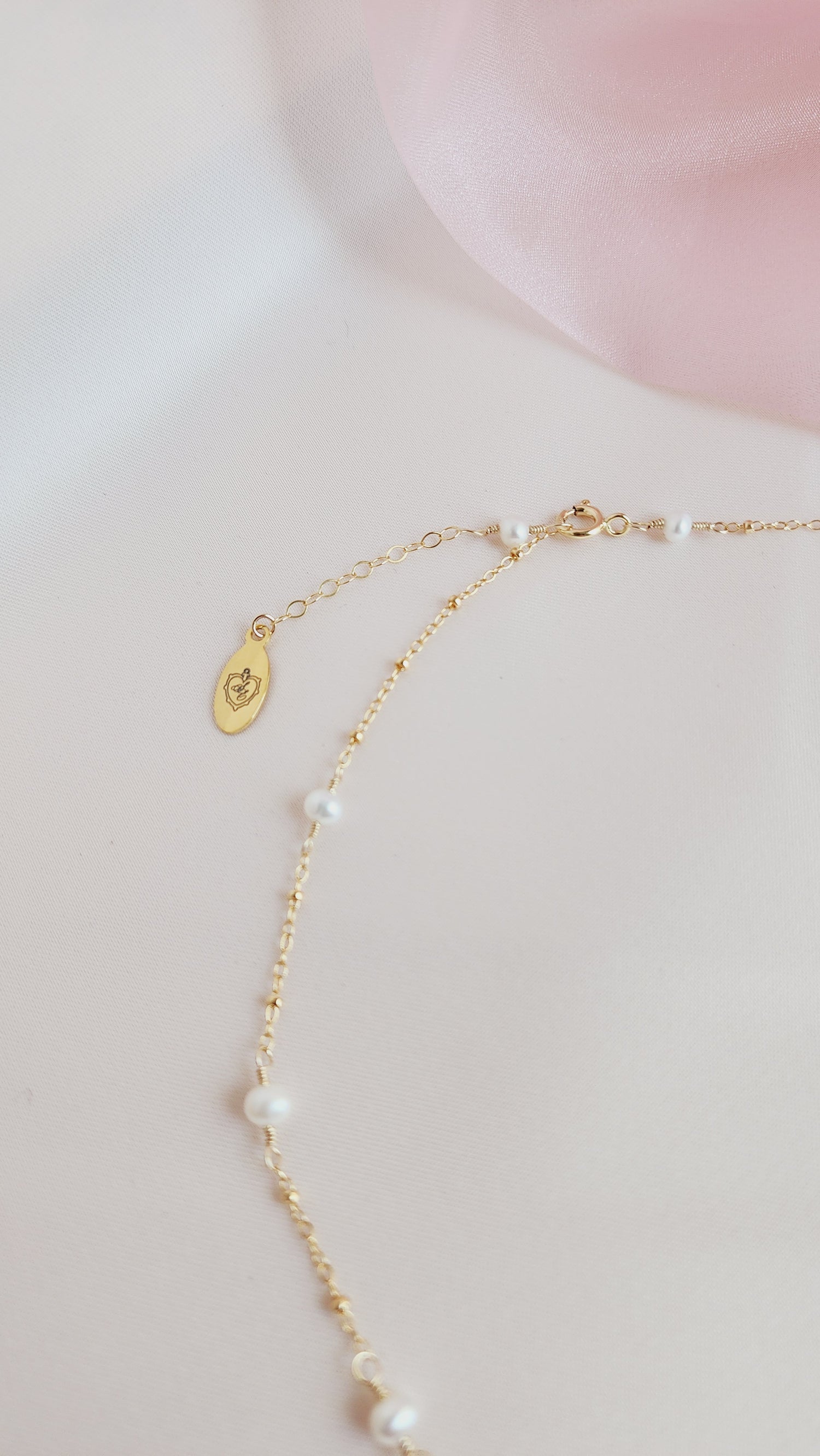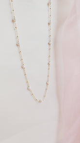 The Pippa Pearl Necklace is the sister design to the Poppy Pearl Necklace, offering an elevated look with my signature textured BB chain. This timeless piece is perfect for any occasion and is loved by many brides for its romantic rosary-inspired motif. The delicate pearls gracefully dance along the chain, softly kissing the neck in a beautifully romantic way.