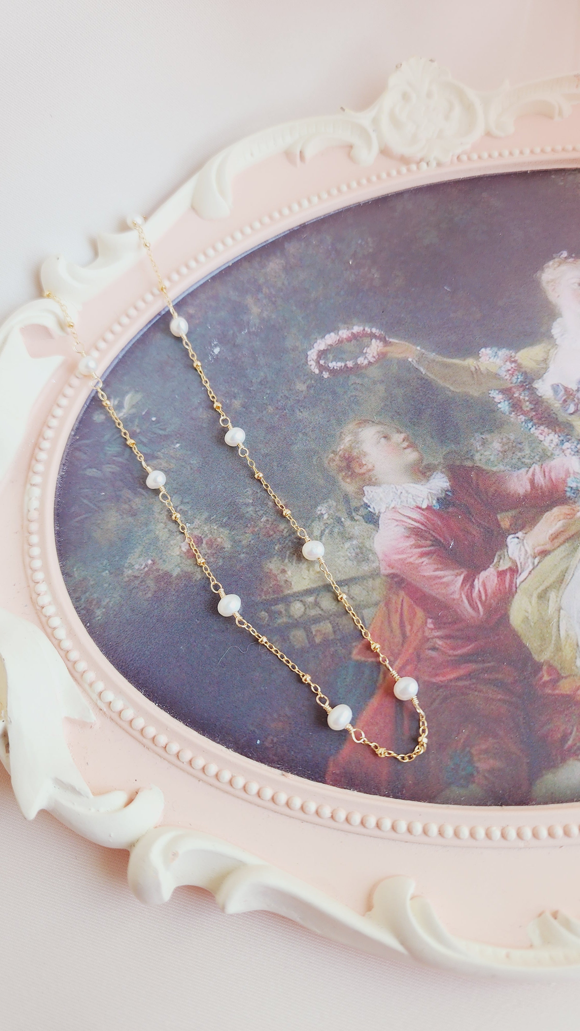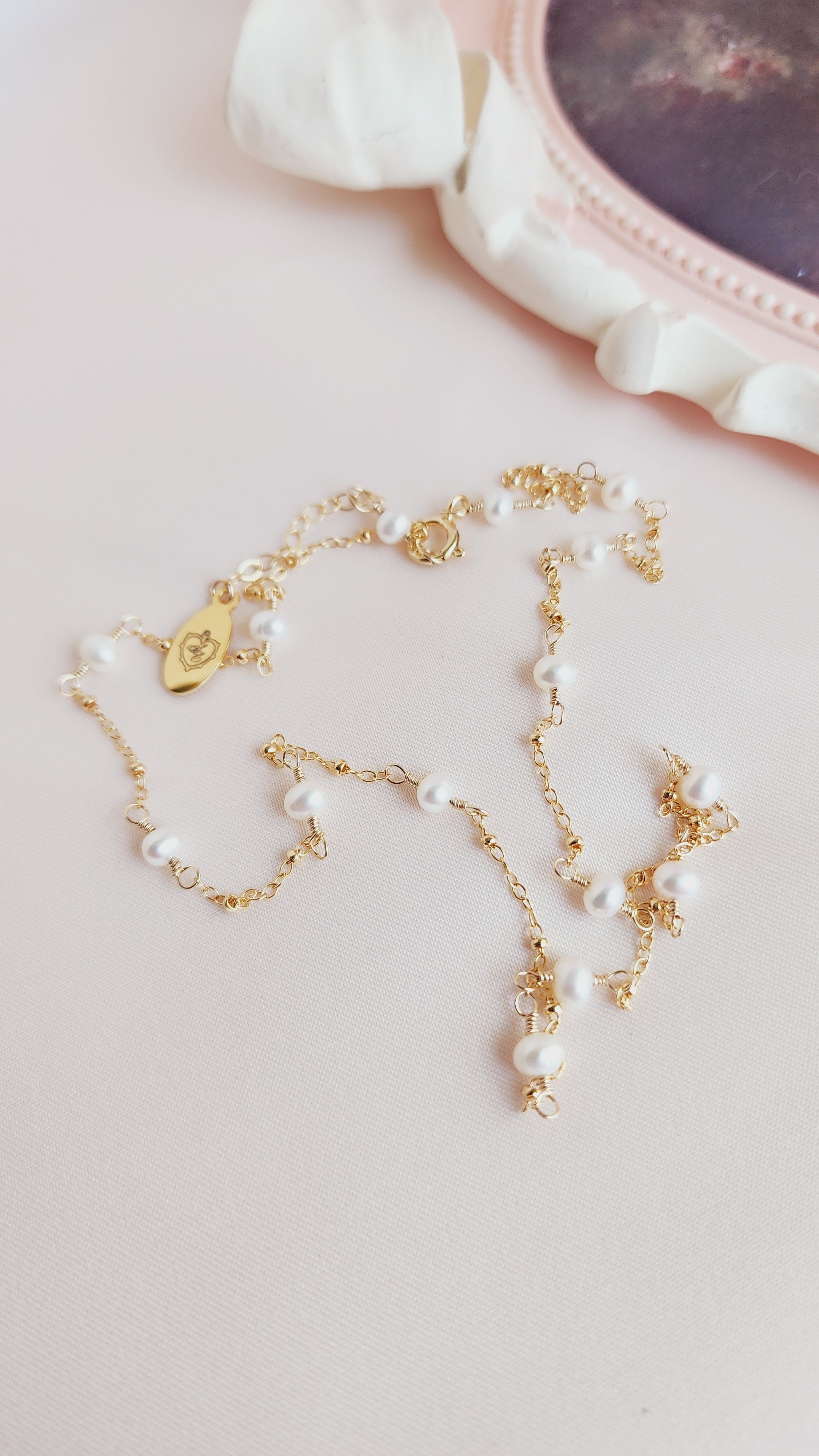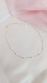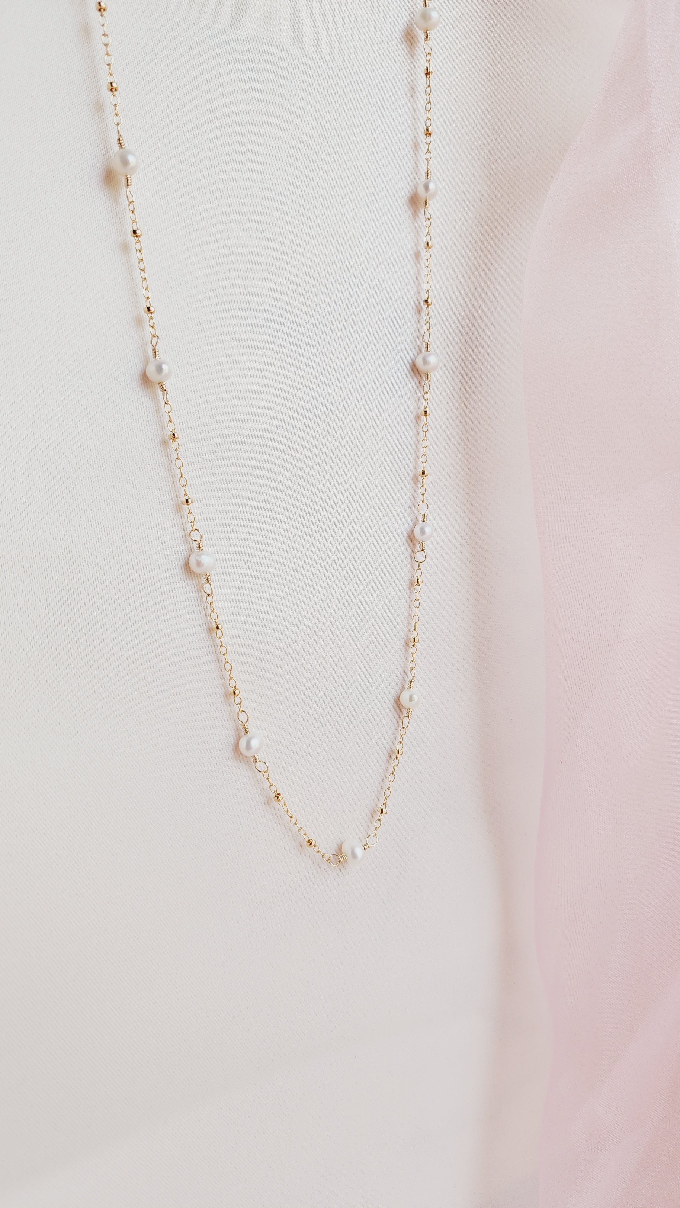 The Pippa Pearl Necklace is the sister design to the Poppy Pearl Necklace, offering an elevated look with my signature textured BB chain. This timeless piece is perfect for any occasion and is loved by many brides for its romantic rosary-inspired motif. The delicate pearls gracefully dance along the chain, softly kissing the neck in a beautifully romantic way.