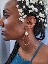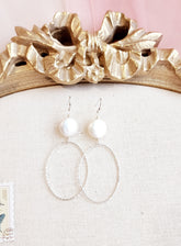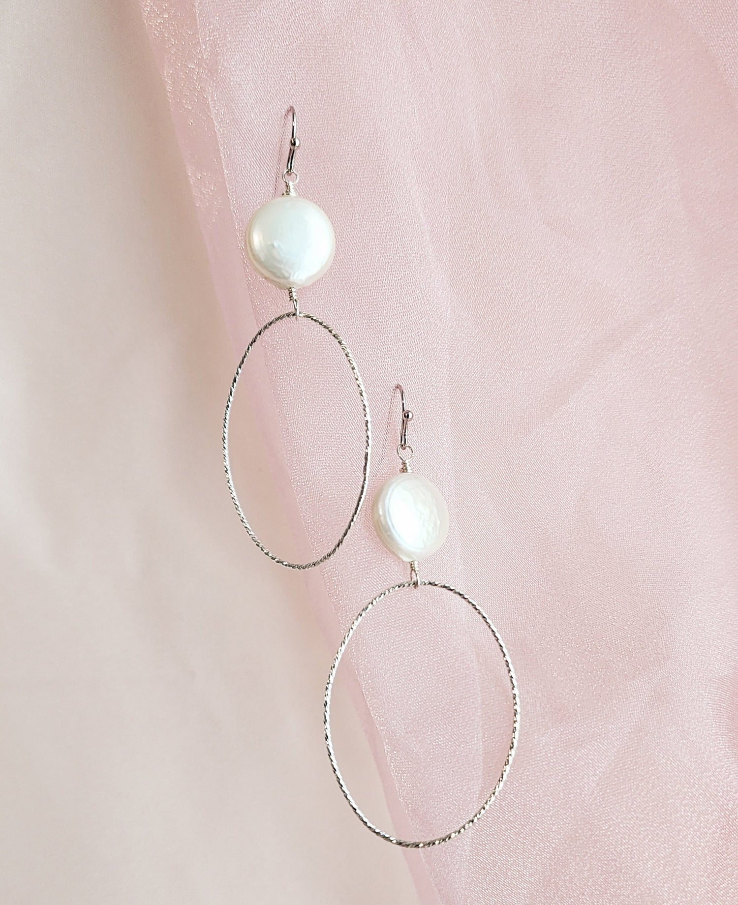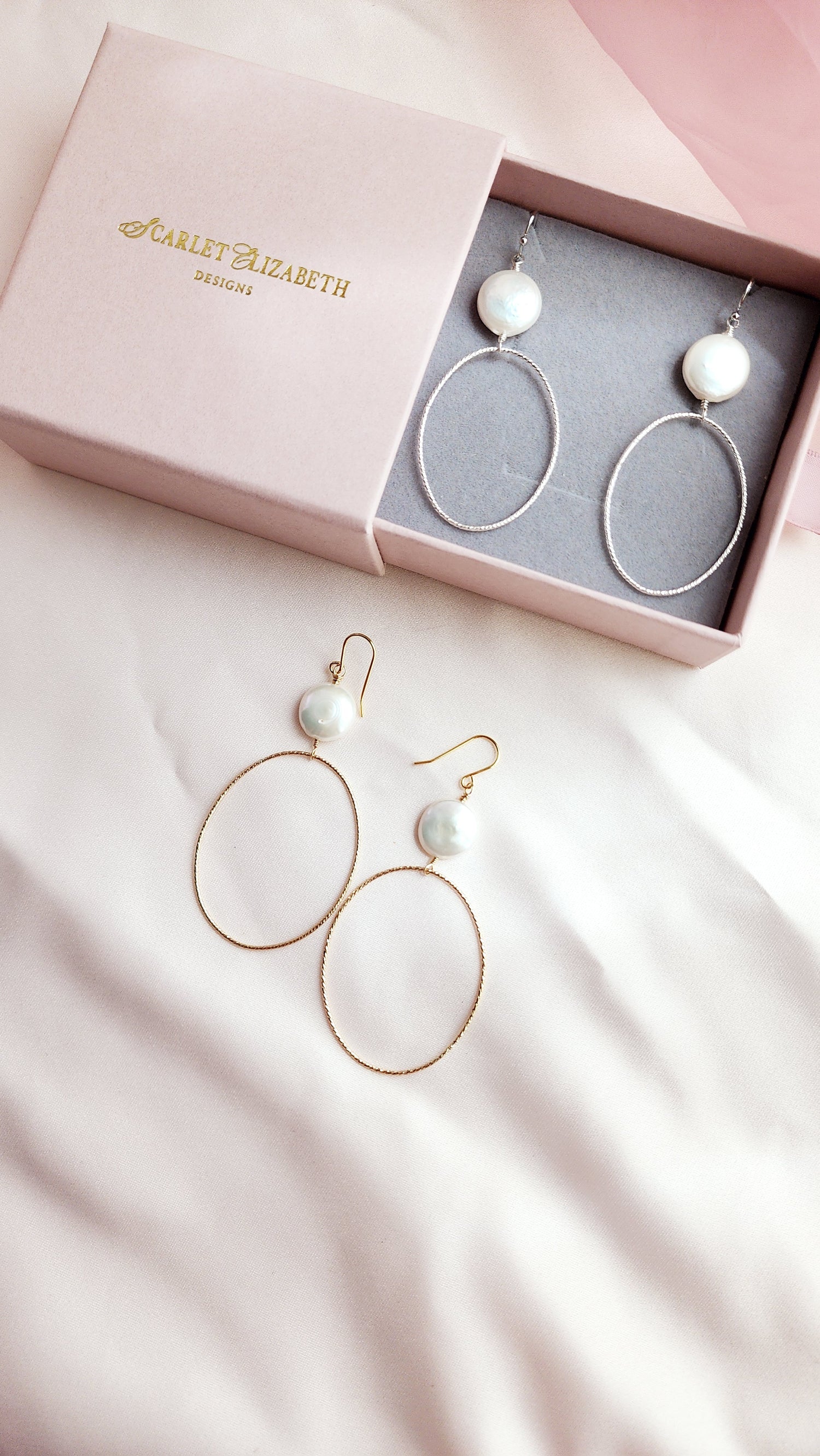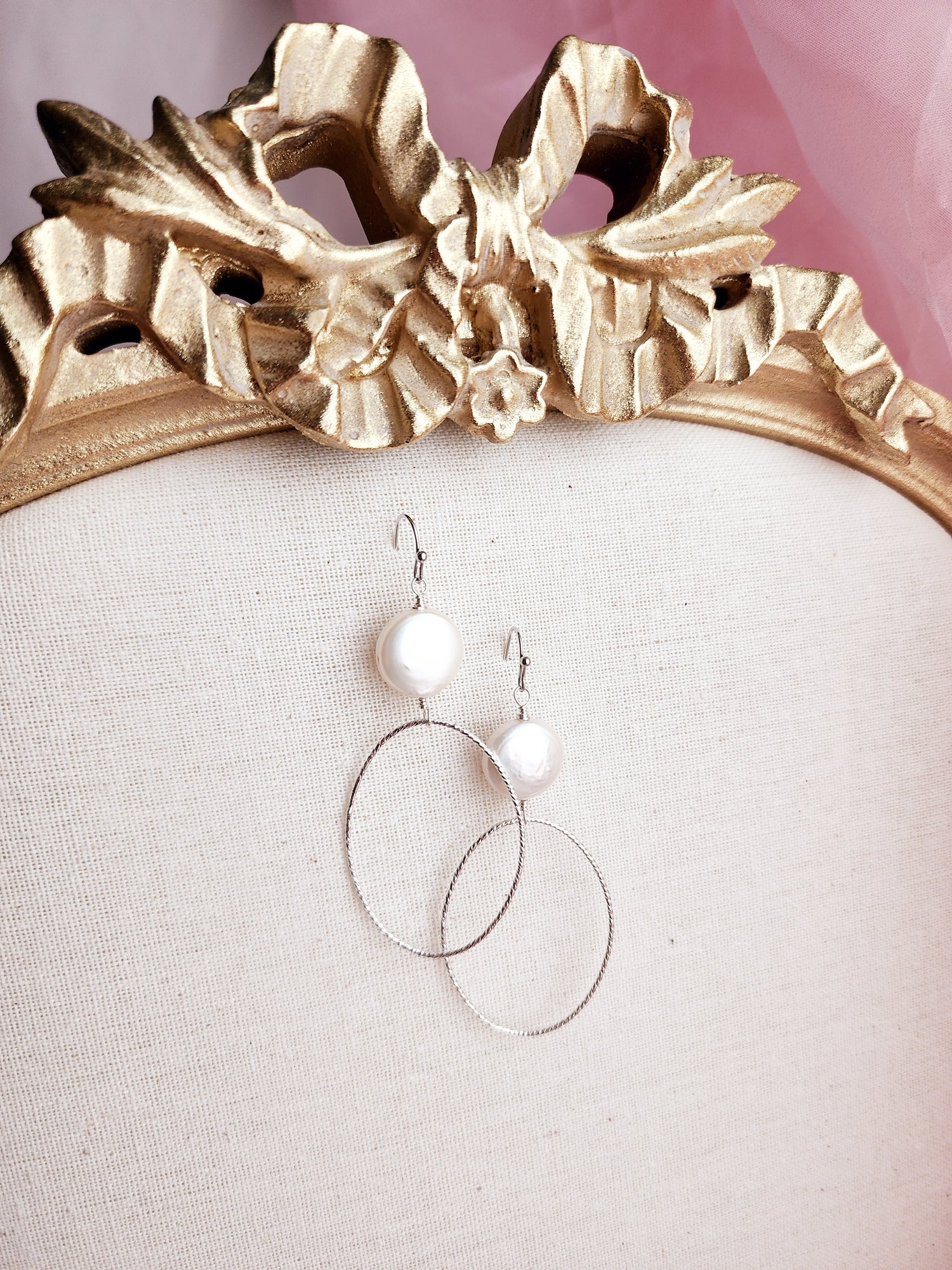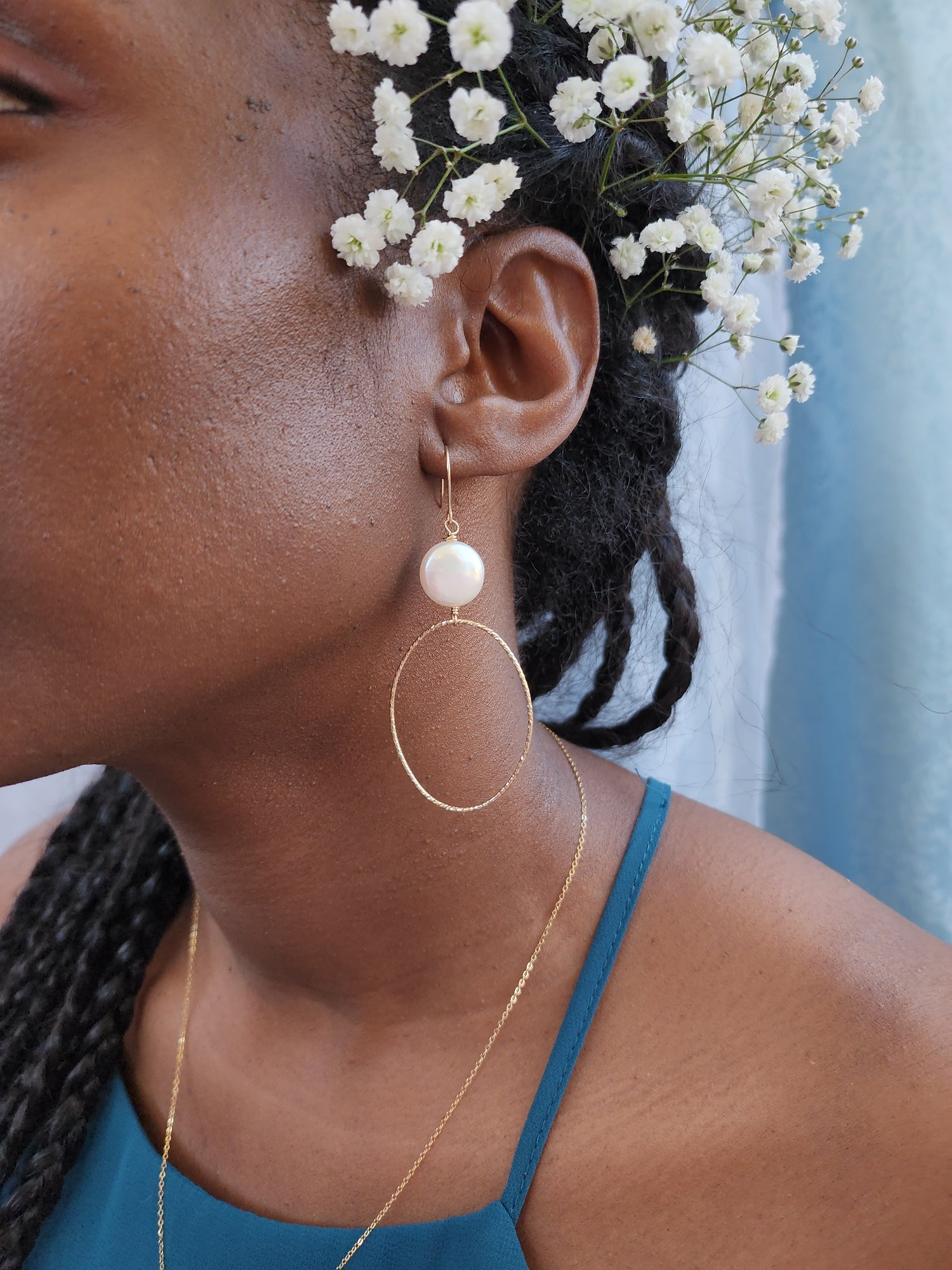 Handmade from diamond-cut wire and carefully soldered, each hoop sparkles beautifully as it catches the light. The luminous Darla coin pearl is wire-wrapped by hand, creating a whimsical, romantic, and slightly edgy look.
