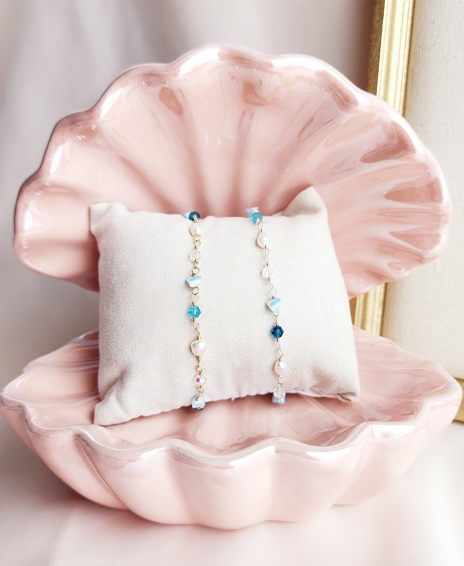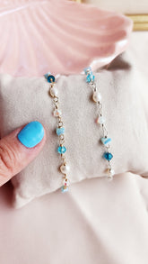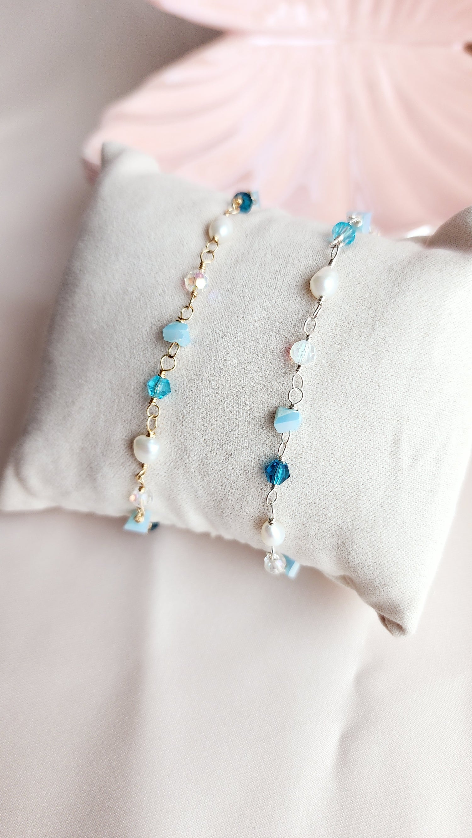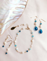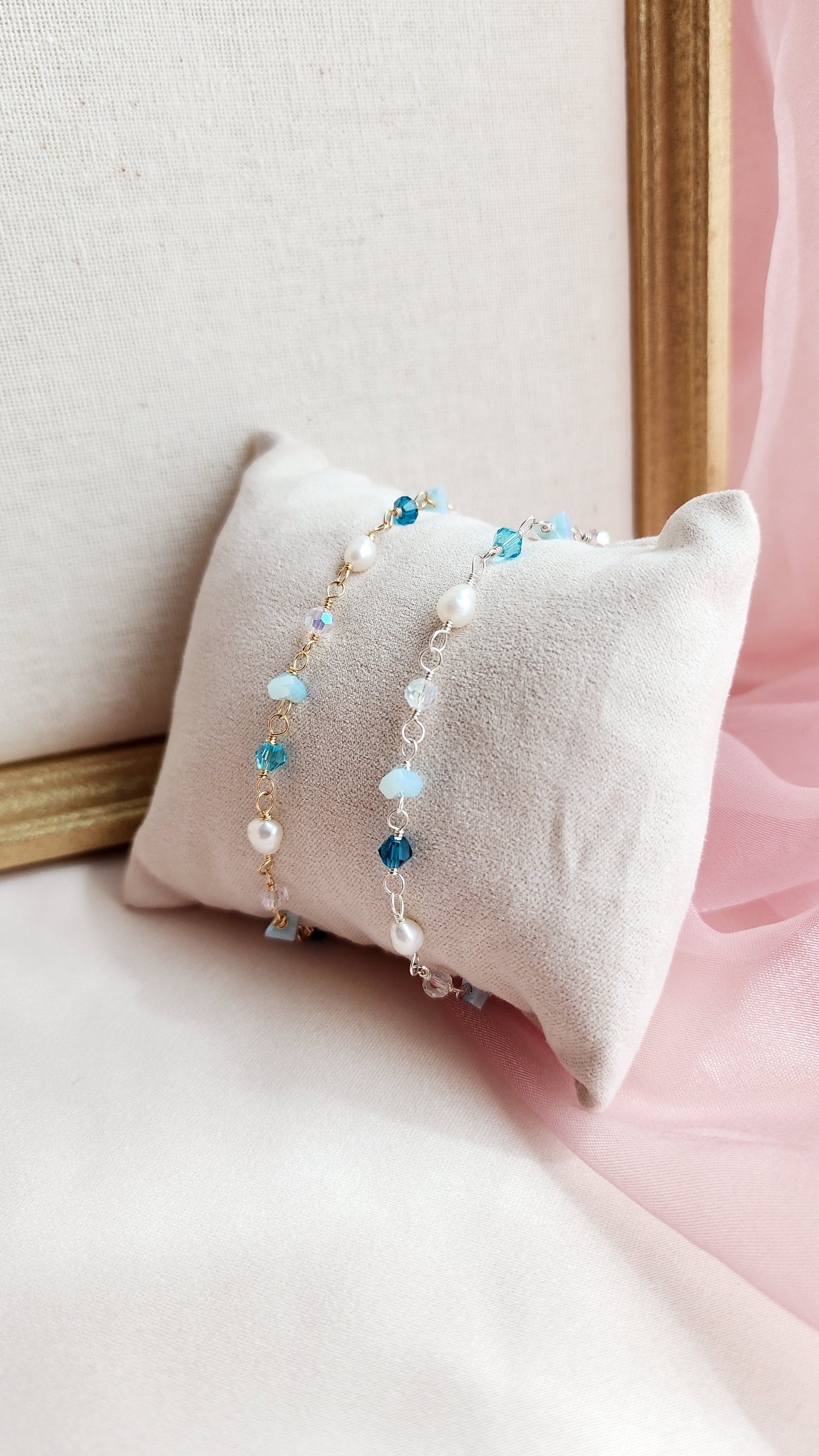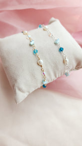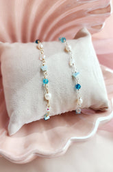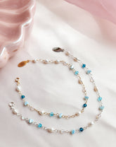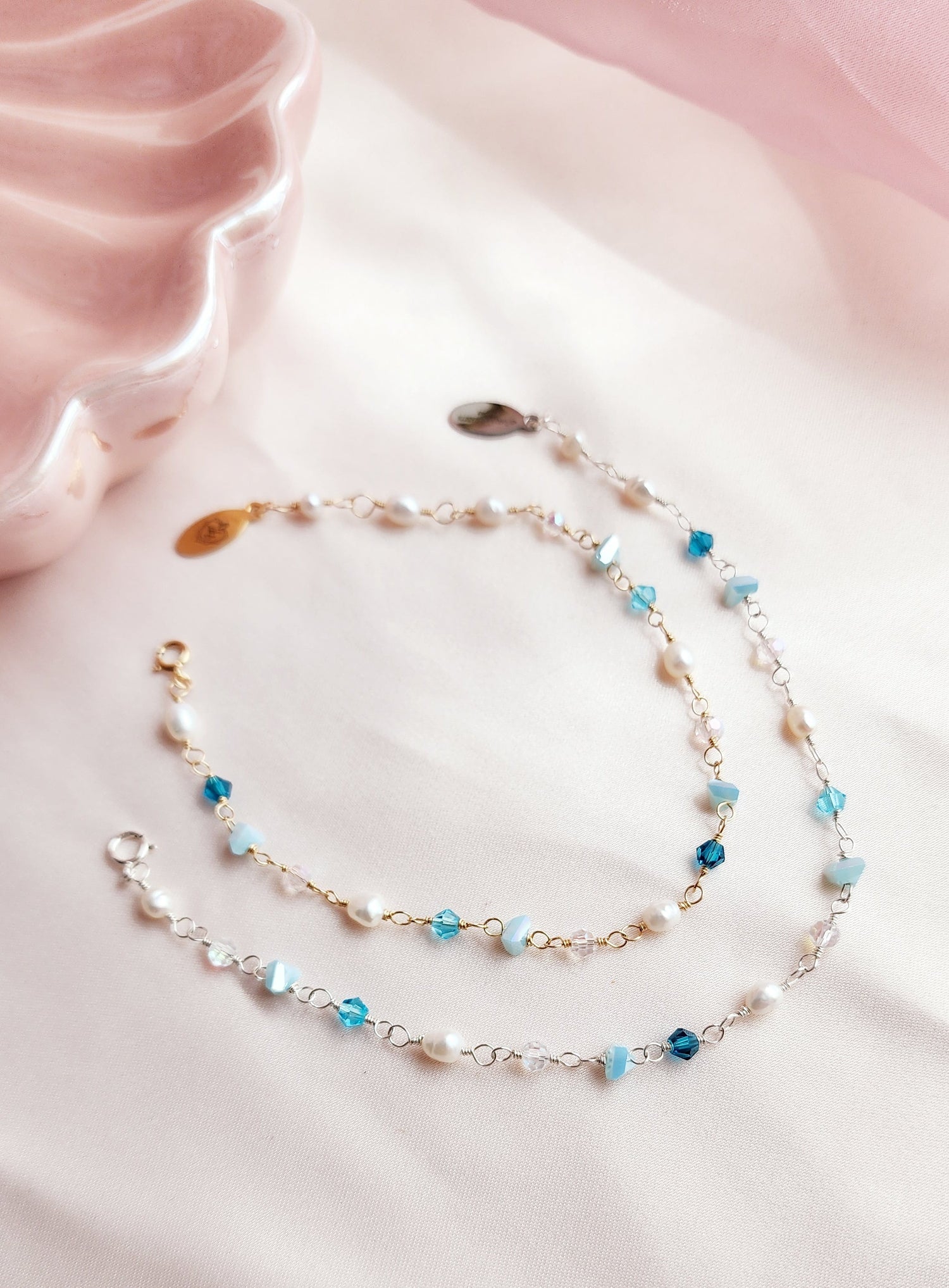 Hand-linked over 2 hours with faceted robin’s egg blue gemstones, sparkling sapphire, sky topaz, and luminous pearls, this piece is a fresh take on the something blue tradition. Designed for the contemporary romantic bride who loves sentimental details—or the everyday woman who adores shades of blue—this versatile piece can be worn as either a bracelet or an anklet.