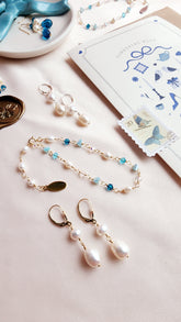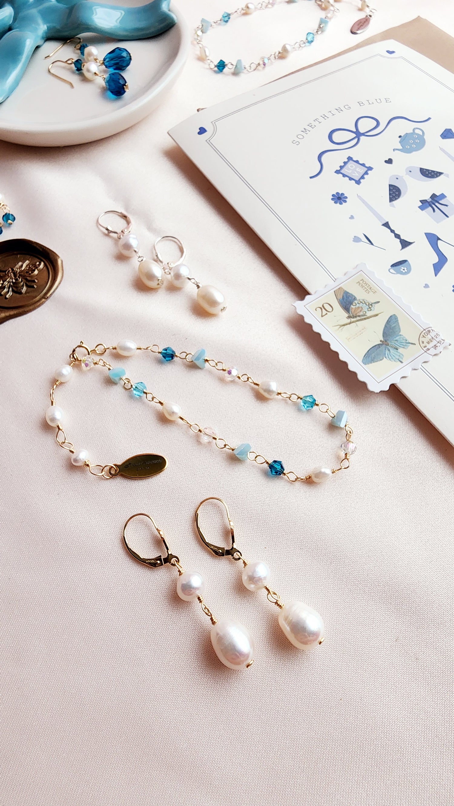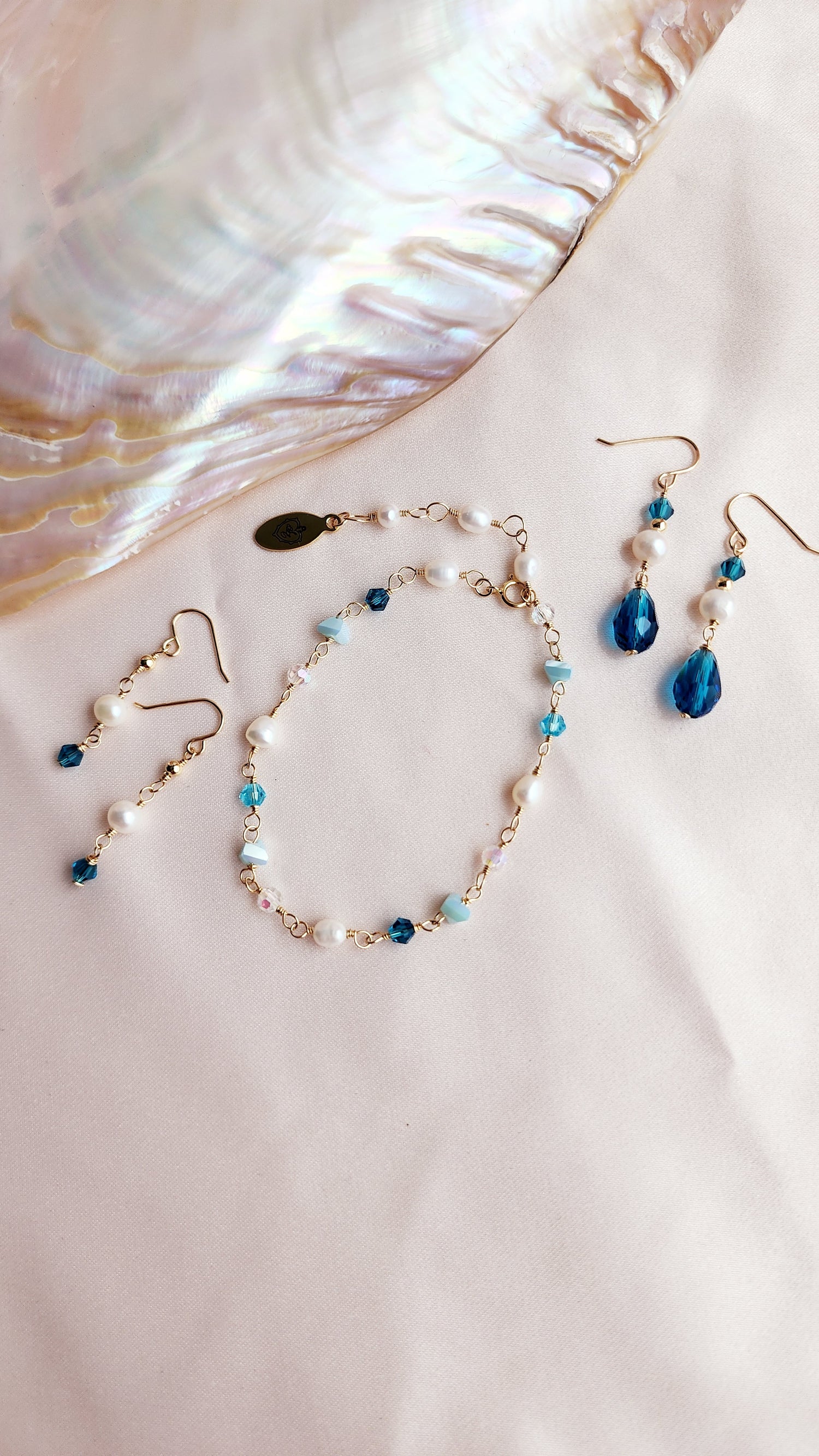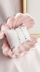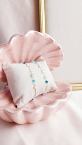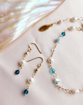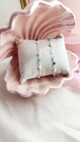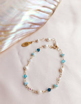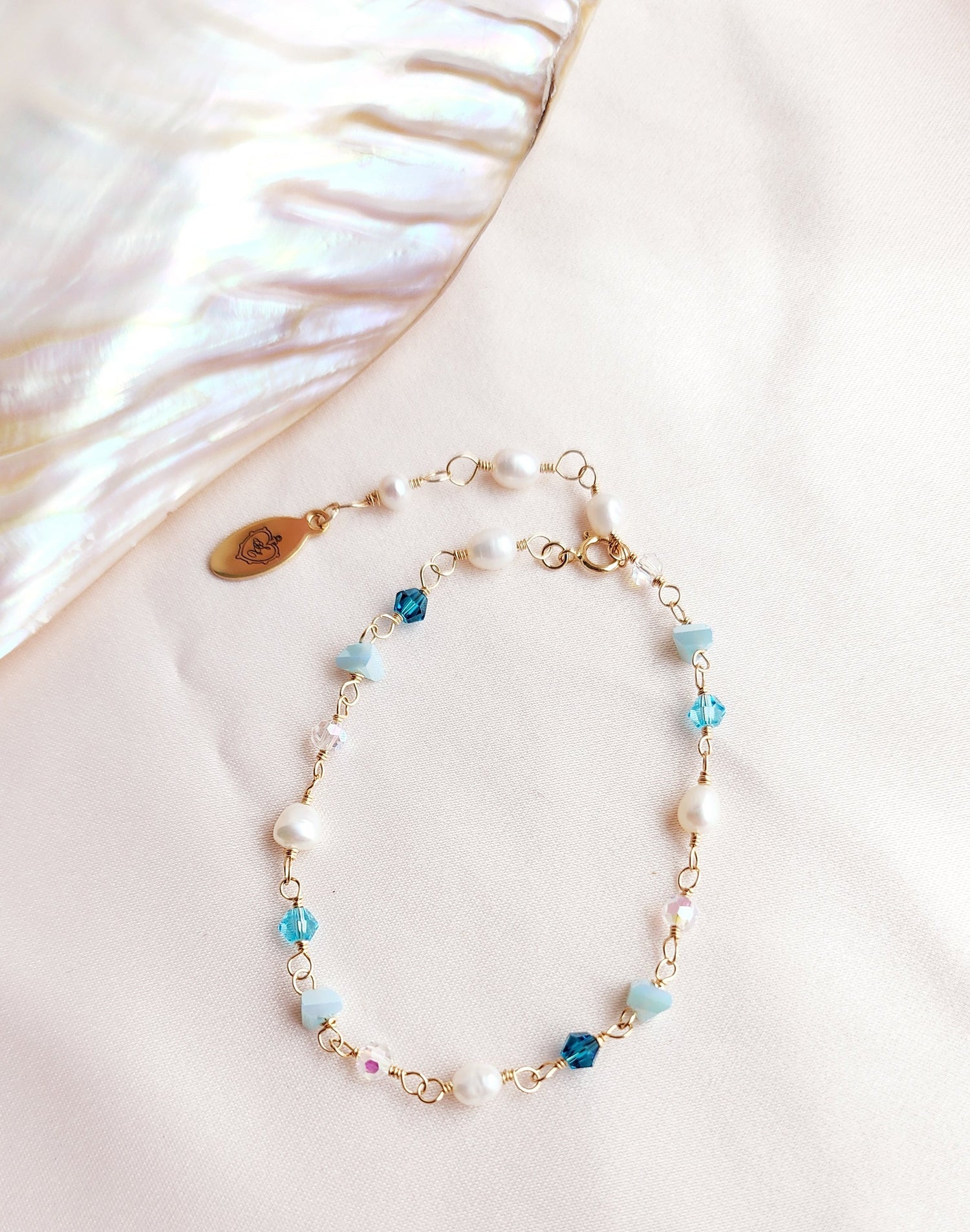 Hand-linked over 2 hours with faceted robin’s egg blue gemstones, sparkling sapphire, sky topaz, and luminous pearls, this piece is a fresh take on the something blue tradition. Designed for the contemporary romantic bride who loves sentimental details—or the everyday woman who adores shades of blue—this versatile piece can be worn as either a bracelet or an anklet.