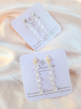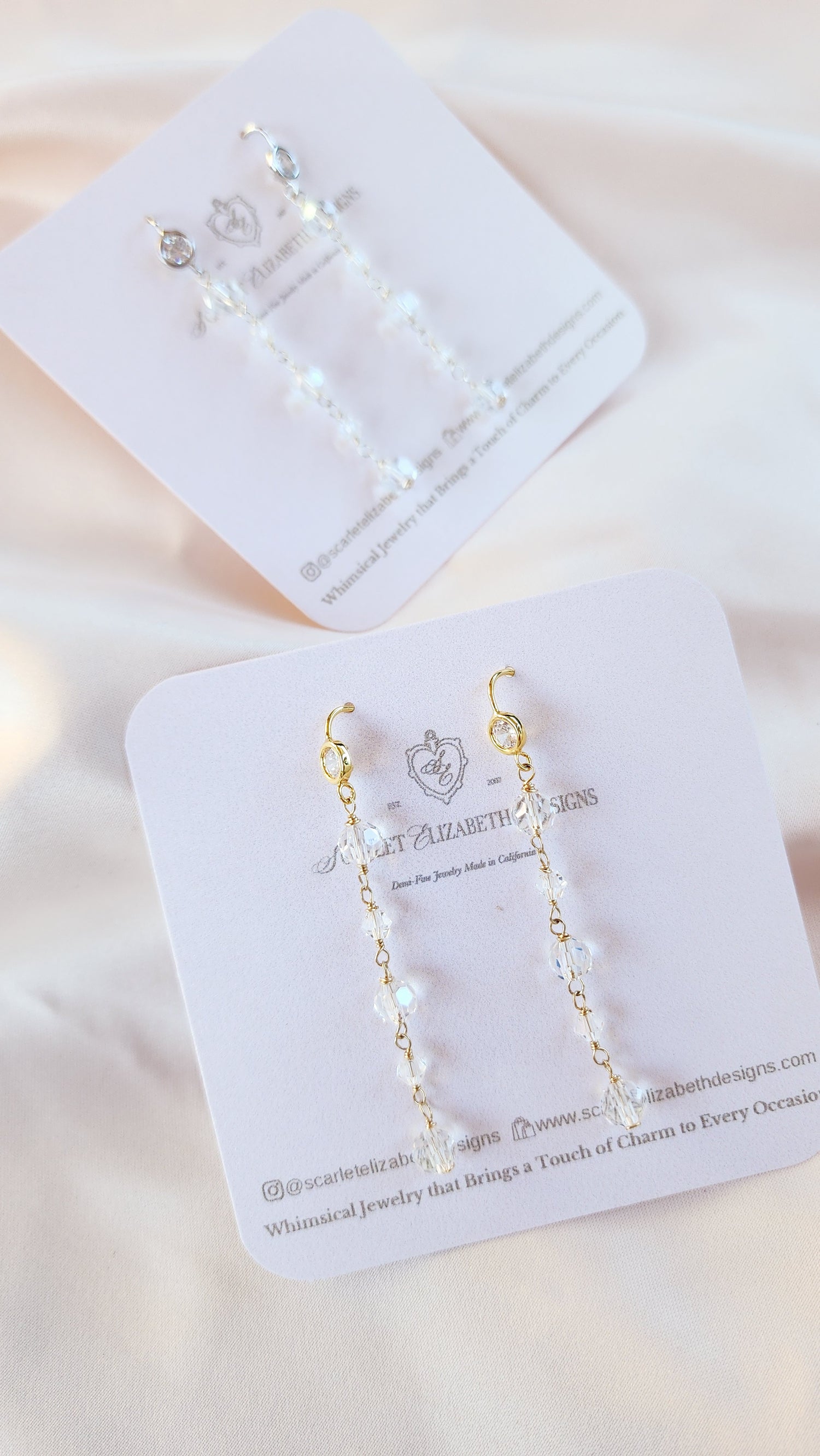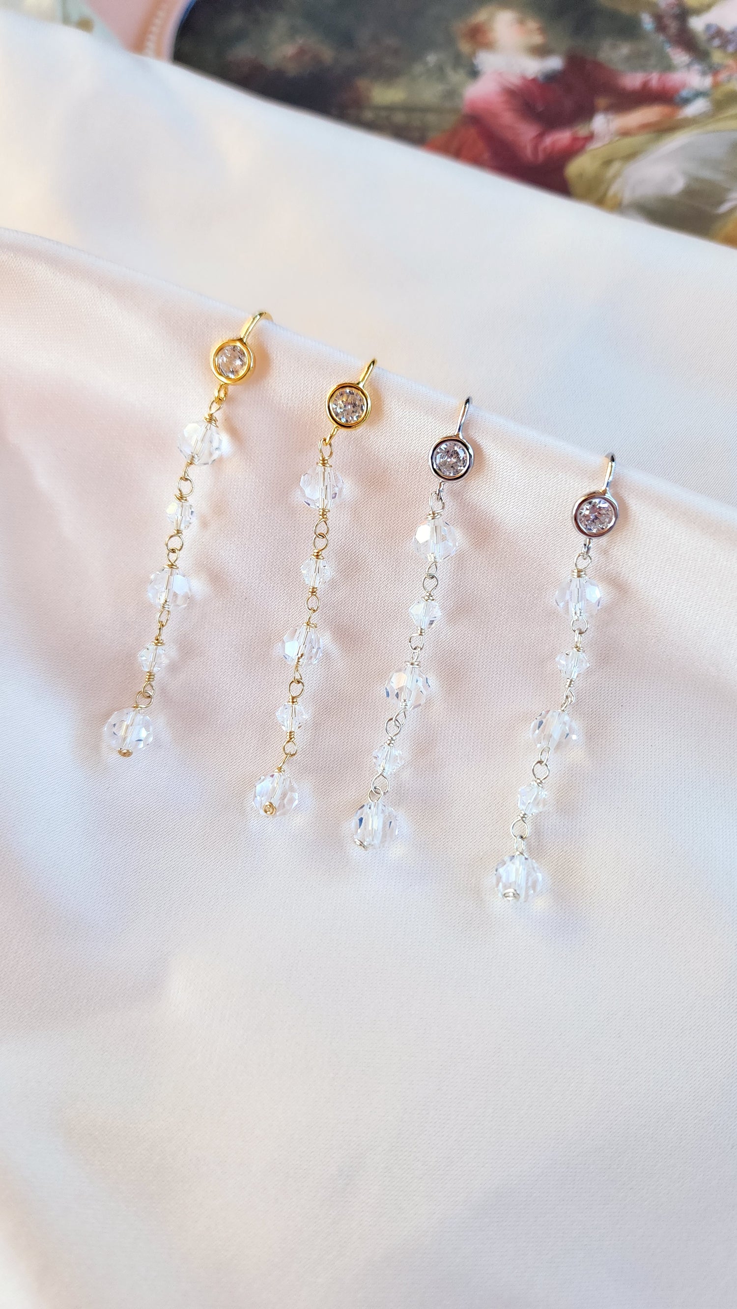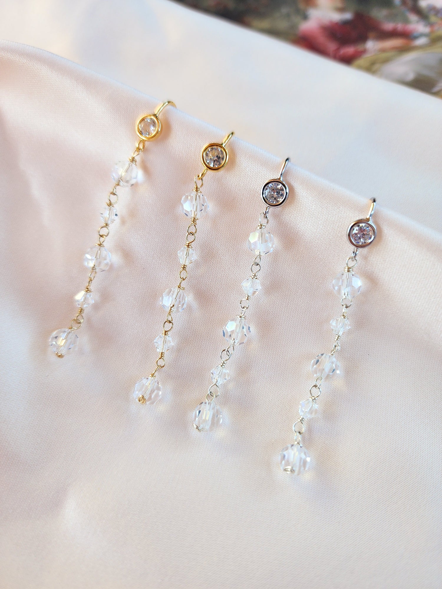 Bring a touch of old-world glamour to your wedding day with these sparkling crystal drop earrings. Inspired by the elegance of The Great Gatsby, each crystal is hand-linked with 14kt gold fill or sterling silver wire for lasting beauty. Dangling from bezel-set CZ earring hooks plated in 16kt gold or rhodium silver, they shimmer with every step while remaining lightweight and hypoallergenic for all-day comfort. At 2" long, they’re the perfect statement—eye-catching whether you wear your hair up or down. Designed for the modern bride who loves sparkle with sophistication, these earrings make you feel unforgettable from “I do” to the last dance.