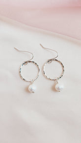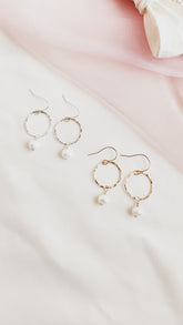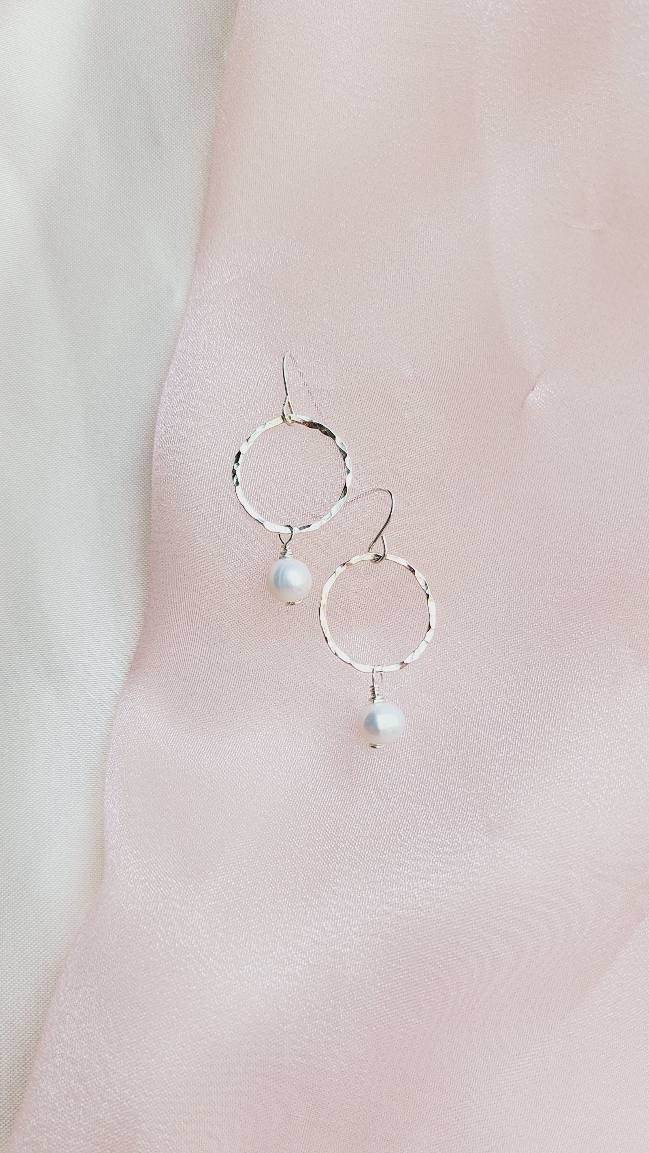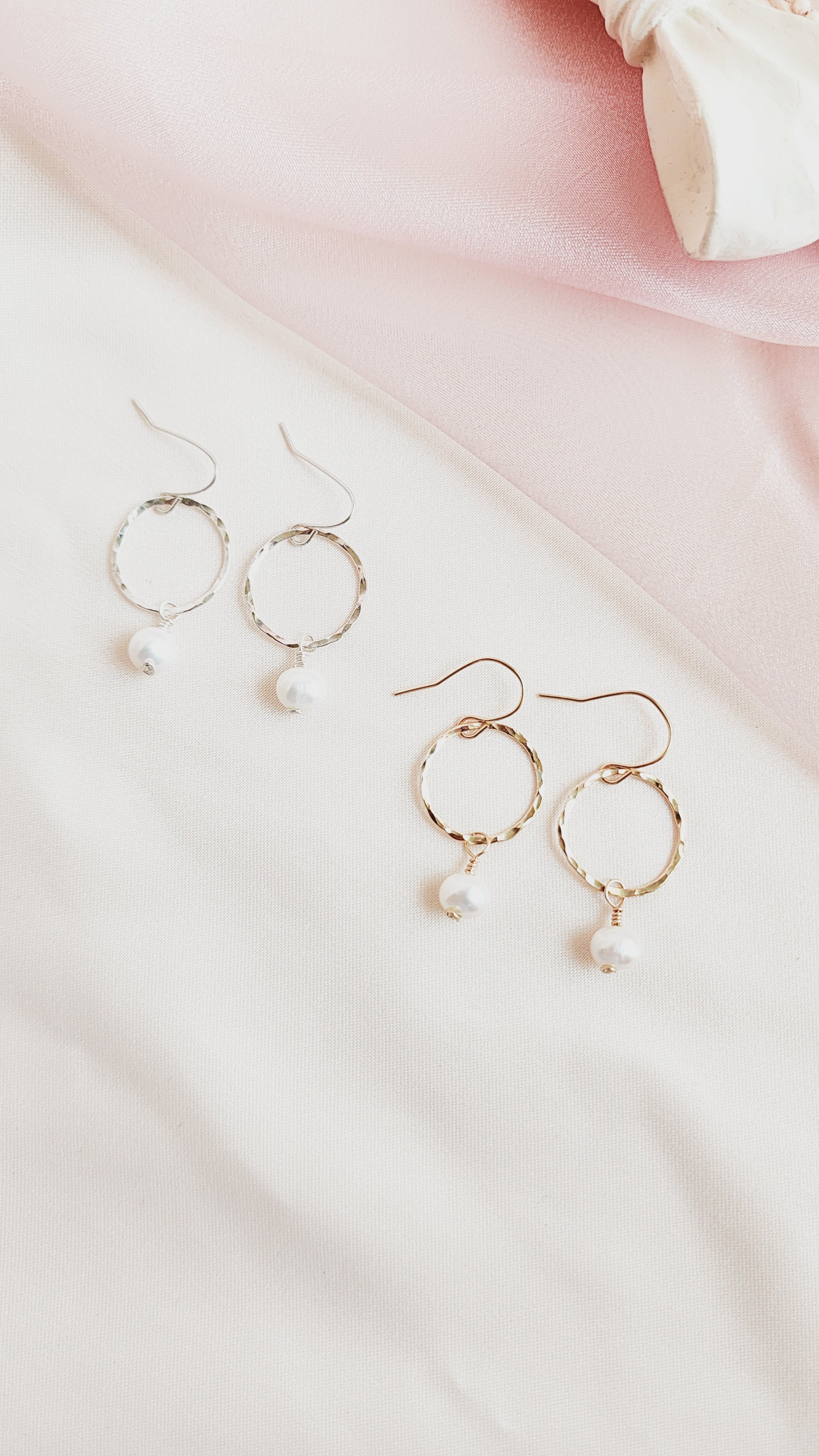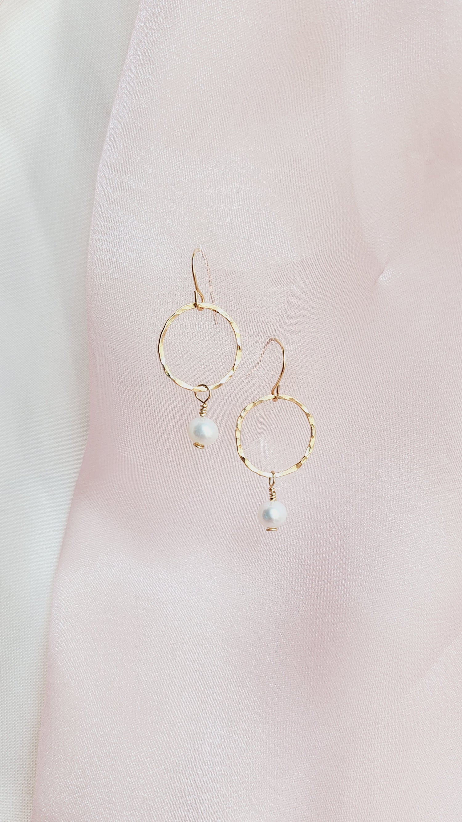 Halo Pearl Hoops are the perfect choice for those who love a simple, effortless look, whether for everyday wear or a special occasion. They make an ideal bridal earring for anyone in the bridal party, adding elegance and seamlessly coordinating with a modern, chic wedding style. The hoops, comparable in size to a nickel at 1.75 inches wide, are extremely lightweight and crafted from 14kt gold fill wire, featuring hand-stamped and polished detailing. Each pair is enhanced with elegant pearls for an added touch of sophistication.